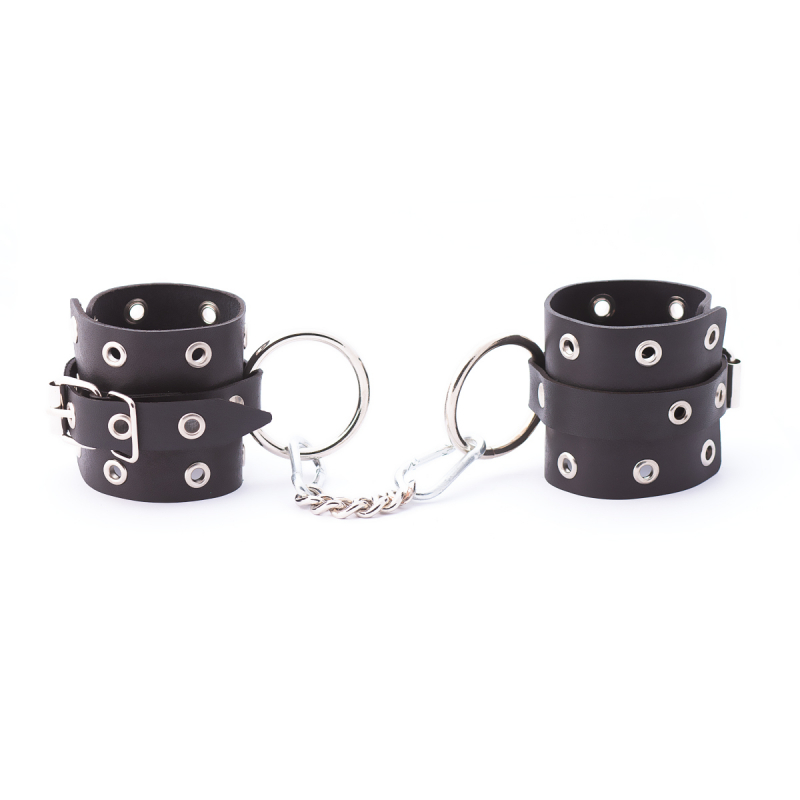 Черные наручники из натуральной кожи с металлическими деталями и люверсами - это незаменимый аттрибут в тематике подчинения!