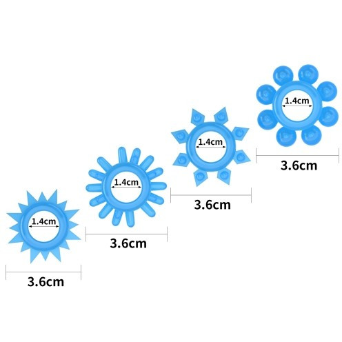 В набор входит 4 кольца с различным рельефом. Выполнены кольца из материала TPE (термопластичный эластомер). По тактильным ощущениям нежные, эластичные. Прекрасно расстягиваются, не пережимают половой член, не врезаются в кожу