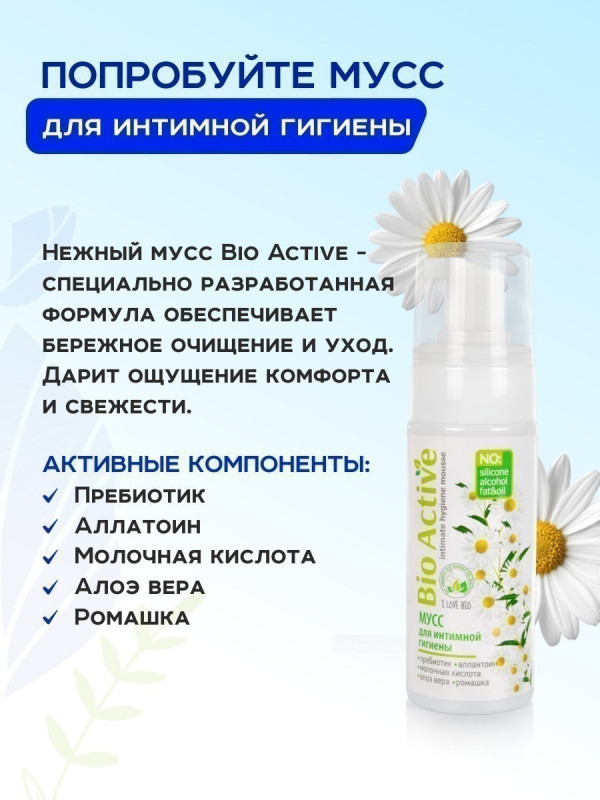 Потрясающий мусс для интимной гигиены "Bio Active" с алоэ вера и ромашкой подарит ощущение свежести и комфорта! Нежная пена деликатно очищает интимные зоны обеспечивая самый бережный уход...